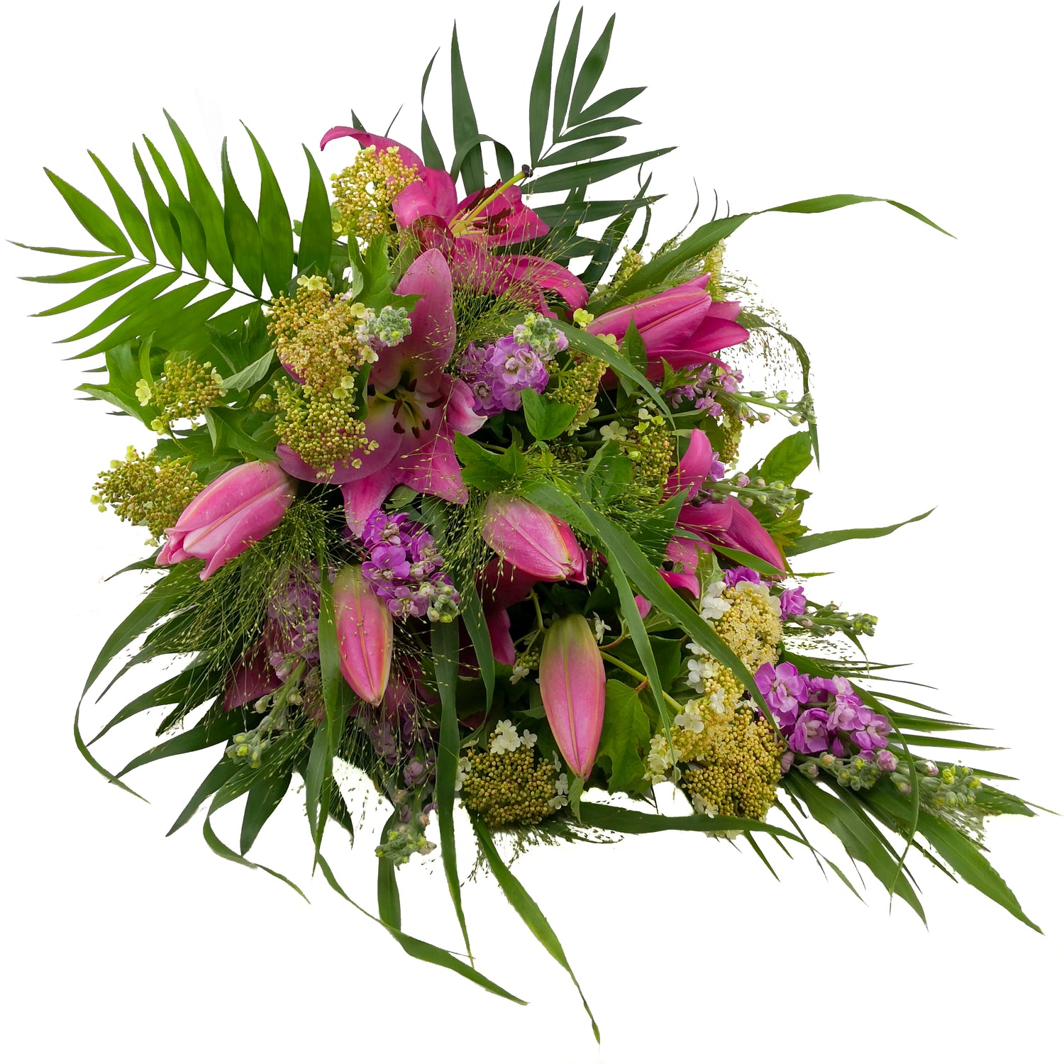 Vis deltagelse i sorgen ved at sende denne smukke og farverige bårebuket direkte til ceremonien i kirken eller kapellet.
